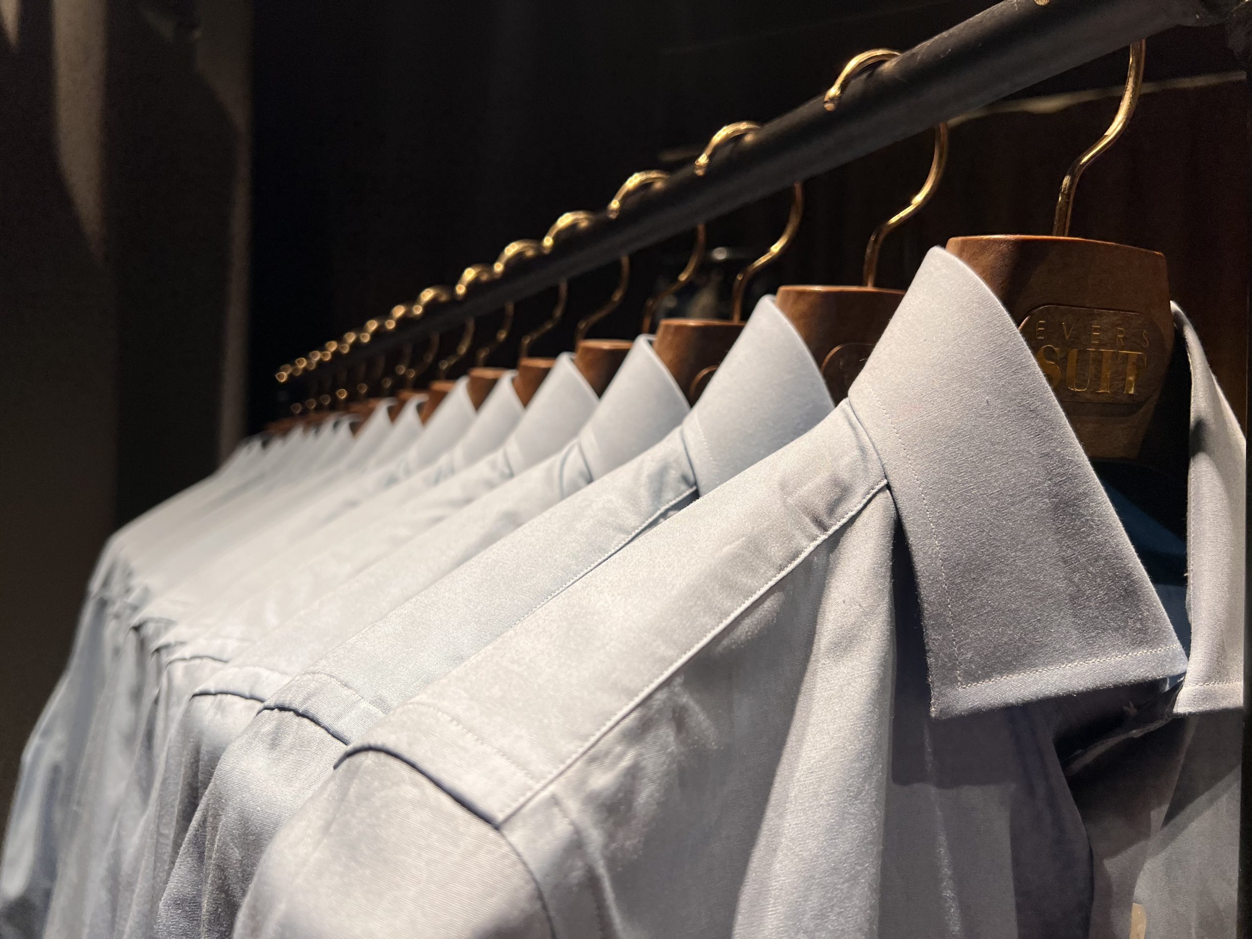 形態安定の生地、イタリアブランどの生地など、豊富な生地を取り揃えております。体のラインに沿ったシルエットから、少しゆったりしたシルエットまで対応しており、お客様の好みに合わせて作成ができます。襟も豊富な種類から選択ができます。最後にネーム刺繍も入れていただきますとさらに世界に一つだけのオリジナルシャツをお届けできます。
